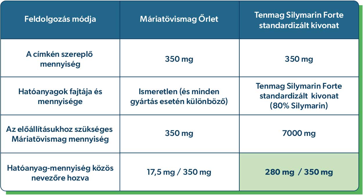 Máriatövismag Őrlet vs. Tenmag Silymarin Forte sandardizált kivonat táblázat: