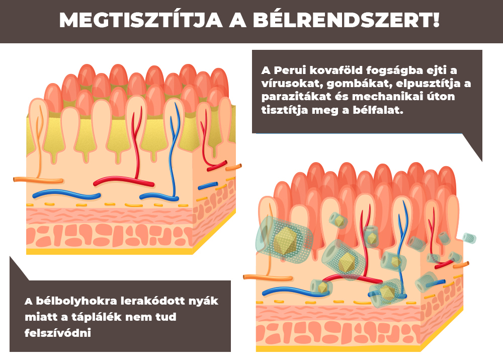 Egyetlen gramm Perui kovaföld 300 m2 bélfelületről képes lehet felszívni és kivezetni a gyulladásos folyadékot, miközben a természetes bélflórát erősíti. Az apró hengerek erős negatív töltésükkel vonzzák és elnyelik a baktériumokat, gombákat, vírusokat, endotoxinokat, gyógyszer- és növényvédőszer-maradványokat, drogokat, nehézfémeket. Csapdába eshetnek a hengerekben és kiürülnek a szervezetből. A férgek, paraziták megsérülnek az éles élek által és elpusztulnak. A termék fogyasztói gyakran jelzik: ”Jobban érzem magam!”. Ez a jobb közérzet abból adódik, hogy minden káros lerakódás eltávolításra kerül a bélrendszerből. A tiszta emésztőrendszer sokkal hatékonyabban dolgozik, jóval több energiához jutunk és így az immunrendszer is hatékonyabbá válik.