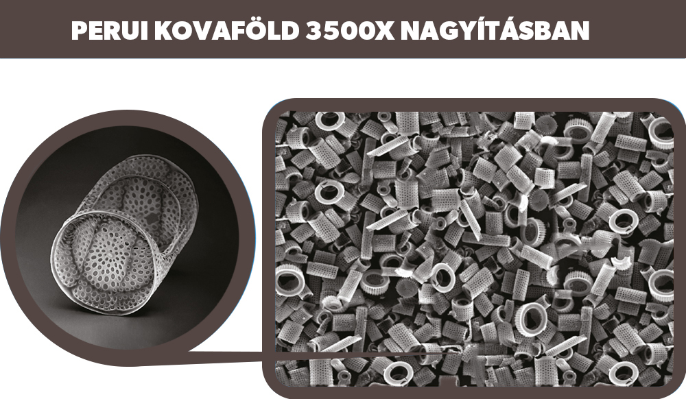Tisztító és méregtelenítő hatékonysága miatt kiemelkedő termék a piacon. Megtisztíthatja a beleket, az ereket és a bőrt. A Perui kovaföld nem csodaszer! Az emberi szervezet a csoda, mely képes megújulni, ha tisztán, rendeltetésszerűen működik. Mindemellett koncentrált mennyiségben tartalmazza szervezetünk egyik fontos tápanyagát, a szilícium-dioxidot. A Perui kovaföld az egyik legtisztább (94%) minőségű étkezési kovaföld. A Perui kovaföld képes lehet hatékonyan kivezetni a baktériumokat, vírusokat és nehézfémeket a szervezetből, pusztán a szerkezetéből adódóan.