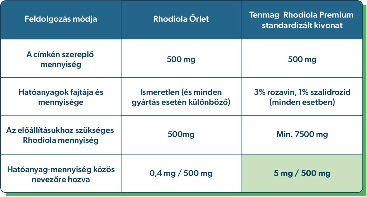 Rhodiola Őrlet vs. Tenmag Rhodiola Premium standardizált kivonat táblázat: